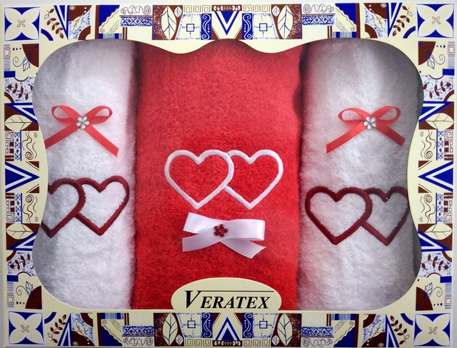 Dárková kazeta - srdíčka obsahuje: 2x bílý ručník o rozměru 50 x 100cm s výšivkou a 1x červená osuška 70 x 140cm s výšivkou. Baleno v dárkové krabici, složení: 100% bavlna.