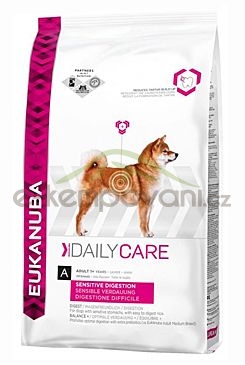 Eukanuba Daily Care je řada 100% kompletních a vyvážených krmiv se všemi esenciálními vitamíny a minerály pro každodenní krmení dospělých, citlivých jedinců. Krmivo Sensitive Digestion upravuje trávení a napomáhá optimalizaci trávicích pochodů. Řepná vláknina je fermentovatelná bakteriemi obsaženými ve psím střevě. Tím, že fermentace je zdrojem výživy převážně pro populaci psímu organismu prospěšných bakterií, dochází ke stabilizaci a optimalizaci střevní mikroflóry. Prebiotické fruktooligosacharidy, jsou pak využitelné pouze a výhradně bakteriemi prospěšnými organismu, jako je například lactobacilus. Mnohé vědecké studie pak prokazují pozitivní efekt právě na skladbu bakterií ve střevě takto krmených jedinců. Výsledkem je pak nejen úprava samotného procesu trávení, ale také pozitivní vliv na fungování imunitního systému, který je u psa z více než 65% lokalizován právě v zažívacím traktu.
