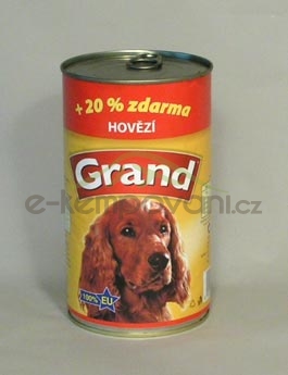 Konzerva GRAND konz. pes hovězí je kompletní krmivo pro psy, vytvořeno z čerstvého masa (min. 60%) bez chemických přísad. Neobsahuje žádné chemické a konzervační přísady ani sóju. Obsahuje podíl vitaminů a aminokyselin v přírodní nepozměněné formě. Do konzerv je přidávána rýžová mouka v maximální míře 0-2 % z důvodu zahuštění masové složky.