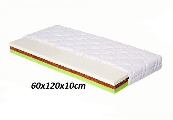 Dětská matrace vyrobena z přírodního latexu kokosového vlákna a studené pěny Výška 10 cm. Možnost praní potahu na 40 °C Materiál potahu - bavlna s polyesterem, prošitý s polyesterovým rounem z dutého vlákna Materiál jádra - vrchní vrstvu tvoří latexová deska ze 100% přírodního latexu, střední vrstva je deska z kokosového vlákna a spodní vrstva je ze studené pěny Prodyšnost matrace - střední Hmotnost matrace 120x60 - 5 kg Zhotovíme libovolné rozměry a tvary matrace