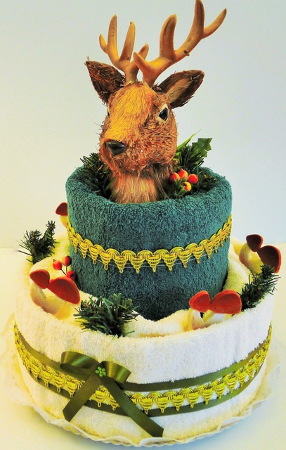 Vhodné jako originální dárek pro myslivce Poslouží i jako ozdoba slavnostního stolu. Textilní dort 3-T obsahuje: 1 x ručník 50x100 cm tmavě zelený (400g) 1 x osuška 70x140 cm smetanová (400g) Složení ručníků a osušek je 100% Bavlna. Praní na ručníků a osušek na 60°C