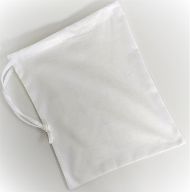 Jednoduchý plátěný pytlík z kvalitní bavlněné látky bílé barvy, stahuje se šňůrkou, 40 x 30 cm. Vhodný pro skladování pečiva/zeleniny. praní 60C°
