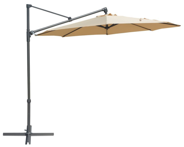 Osmiramenný BOČNÍ slunečník s moderním designem a pevnou konstrukcí. Součástí slunečníku je křížový podstavec, který je zapotřebí zatížit dlaždicemi. Slunečník se otevírá pomocí kličky. Lze u něho nastavit úhel stínění jednoduchým posunutím po stojné tyči. Zároveň je zde i možnost otáčení o 360° za pomoci pedálu. Potah má vodoodpudivý nástřik, který Vás ochrání před mírným deštěm. S PODSTAVCEM