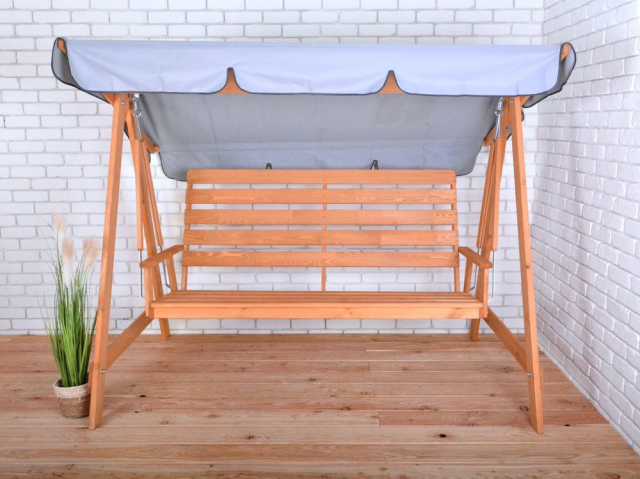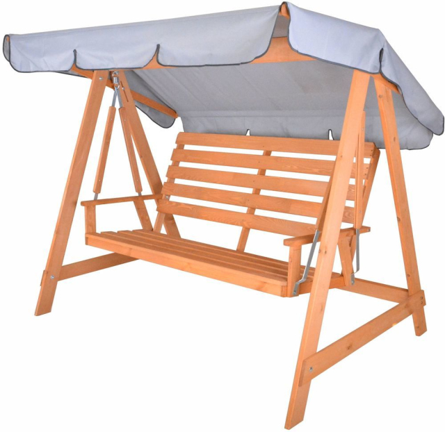 Dřevěná zahradní houpačka z borovicového dřeva a s šedou stříškou. Konstrukce je mořená do medové barvy. Houpačka je vhodná pro 3 osoby. Hodí se skvěle jak na zahradu, terasu či dvorek. Certifikát FSC zaručuje, že použité dřevo pochází ze šetrně obhospodařovaných lesů, ve kterých jsou dodržovány přísné ekologické asociální požadavky.