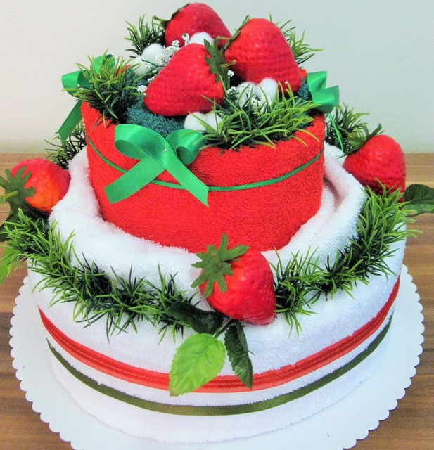 Textilní dort 2 - L dvoupatrový Textilní dort obsahuje: 1 x červený ručník 50 x 100cm, 1x bílá osuška 70 x 140cm, 1 x 30 x 50cm tm.zelený ručník Složení ručníků: 100% Bavlna Vhodné jako dárek k narozeninám, jako dekorace na slavnostní stůl.