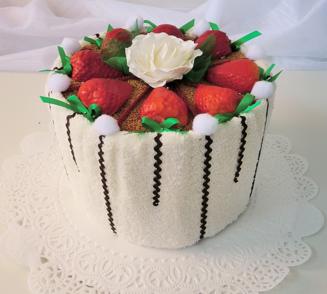 Textilní dort obsahuje: 1 x ručník 50x100 cm smetanový (400g) 1 x ručník 30x50 cm oříškový (400g) Složení ručníků je 100% Bavlna. Praní 60°C. Krásná dekorace, nebo originální dárek.