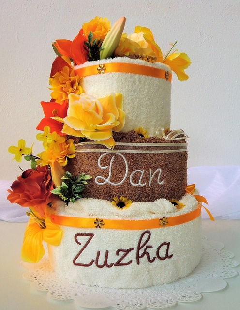 Text pro výšivku napište do poznámky. Textilní dort obsahuje: 1x froté ručník 50/100 smetanový 1x froté osuška 70/140 oříšková 1x froté ručník 50/100cm oříškový 1x froté osuška 70/140 cm smetanová (froté 400g) Na ručníku a na osušce je vyšito jméno novomanželů Dárek je vhodný jako svatební dar - k narozeninám - svátku. praní ručníků 60°C