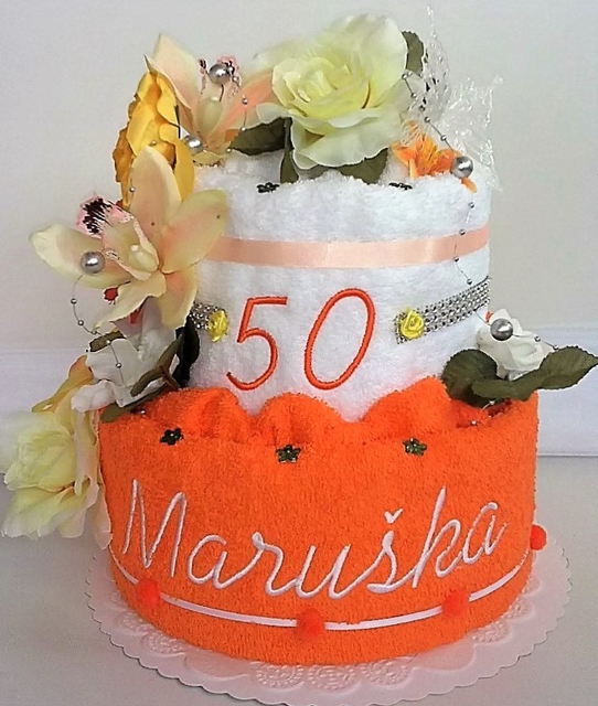 Výšivku + barvu dortu napište do poznámky. Textilní dort obsahuje kvalitní froté 450g/m2: 1x froté ručník 50/100cm - 1x froté osušku 70/140cm Na ručníku a na osušce je vyšito jméno-přezdívka. Dárek je vhodný jako svatební dar - k narozeninám - svátku. Praní ručníků 60°C.