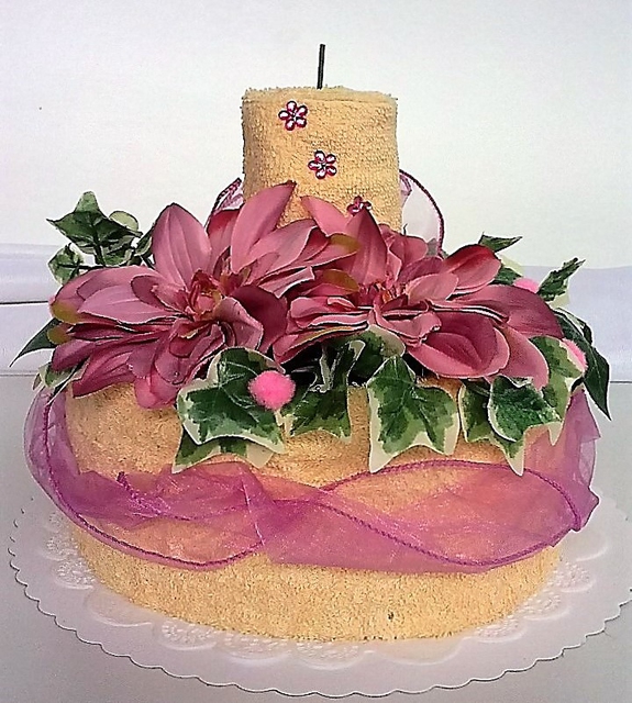 Krásná dekorace,nebo originální dárek Textilní dort obsahuje: 1 x ručník 50x100 cm sv.žlutý (400g) * 1 x ručník 30x50 cm sv.žlutý (400g) Složení ručníků je 100% Bavlna Praní ručníků 60°C