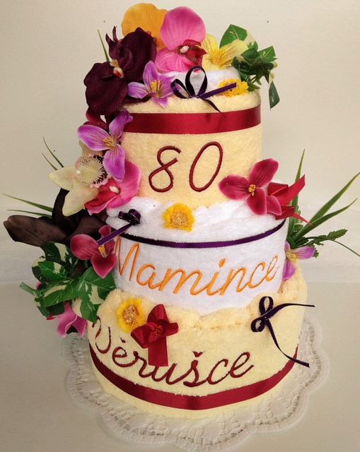 Text pro výšivku napište do poznámky. Textilní dort obsahuje: 2x froté ručník 50/100cm, 2x froté osuška 70/140cm froté (450g/m2) Na ručníku a na osušce je vyšito jméno-přezdívka. Dárek je vhodný jako svatební dar - k narozeninám - svátku. Praní ručníků 60°C.