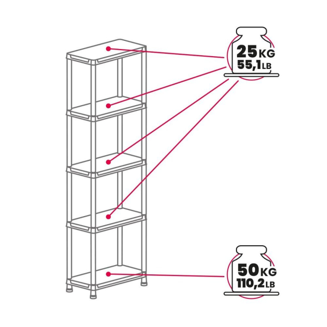 Představujeme Vám plastový regál UNIVERSAL PRO 63-5, špičkový pomocník pro uskladnění. ODOLNÝ RECYKLOVANÝ MATERIÁL A UNIVERZÁLNÍ POUŽITÍ Vytvořen z vysoce odolného recyklovaného materiálu, tento regál zaručuje dlouhou životnost a spolehlivost i v náročných podmínkách. Regál je určen pro vnitřní použití. Je ideální pro širokou škálu prostředí včetně dílen, garáží, zahradních domků a provozních hal. S jistotou odolává běžnému opotřebení a zajišťuje dlouhodobou spolehlivost. ELEGANTNÍ DESIGN S moderní černou barvou dodává prostředí profesionální vzhled, zatímco jeho robustní konstrukce poskytuje odolnost a dlouhou životnost. Vytvořte si prostor, který je nejen praktický, ale také vizuálně přitažlivý. NOSNOST A PEVNOST Regál disponuje pěti policemi. Spodní police má nosnost až 50 kg, zatímco další čtyři police jsou schopny unést až 25 kg, což umožňuje bezpečné a efektivní uskladnění různorodých předmětů a vybavení. JEDNODUCHÁ MONTÁŽ Díky použití běžného nářadí je montáž tohoto regálu hračkou. Navíc pro zajištění ještě větší stability máte možnost připevnit ho ke zdi, což je ideální pro prostředí, kde je vyšší pohyb. CERTIFIKACE Regál je certifikován TÜV SÜD, což zaručuje jeho bezpečnost a kvalitu dle nejvyšších standardů. Můžete mít jistotu, že Váš regál splňuje veškeré bezpečnostní a kvalitativní požadavky. Plastový regál UNIVERSAL PRO 63-5 je dokonalým řešením pro ty, kteří hledají spolehlivost, jednoduchost a všestrannost při uskladnění. Nechte se okouzlit jeho funkčností a jednoduchostí použití, která Vám usnadní každodenní organizaci Vašeho prostoru.