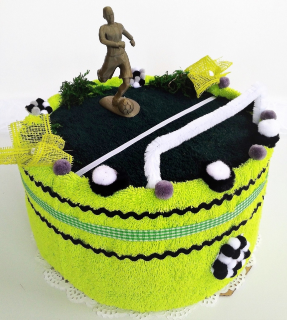 Fotbalový textilní dort (možnost dovyšití jména / přezdívky doplatek 75Kč výšivku napíšete do poznámky) obsahuje: 1ks žlutozelená osuška 70x140 cm + 1ks tm.zelený ručník 30x50 cm + dekorace Složení ručníků: 100% Bavlna, praní 60°C Vhodné jako originální dárek.