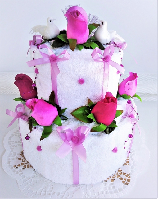 Textilní dort dvoupatrový Textilní dort obsahuje: 2 x bílý ručník 50x100cm 1 x bílá osuška 70x140 cm 100% Bavlna, vhodné jako svatební dar nebo originální dárek - praní 60°C.