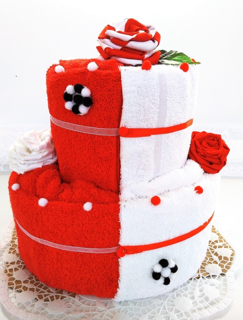 Textilní dort dvoupatrový dort obsahuje 1ks červený ručník 50x100cm, 1ks bílý ručník 50x100cm 1ks červená osuška 70x140cm, 1ks bílý ručník 30x30cm 100% Bavlna, vhodné jako originální dárek - praní 40°C.