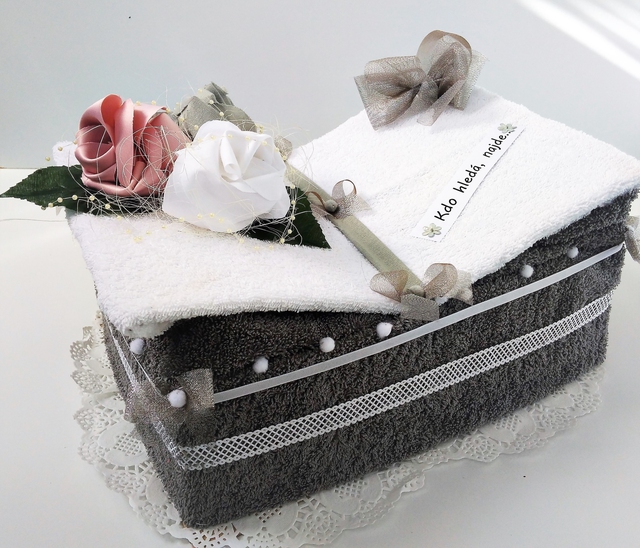 Textilní dort kniha 2 x bílý ručník 30x50cm, 1x světle šedá osuška 70x140cm gramáž: 400g/m2 Složení ručníků: 100% Bavlna, Vhodné jako svatební dar nebo originální dárek.