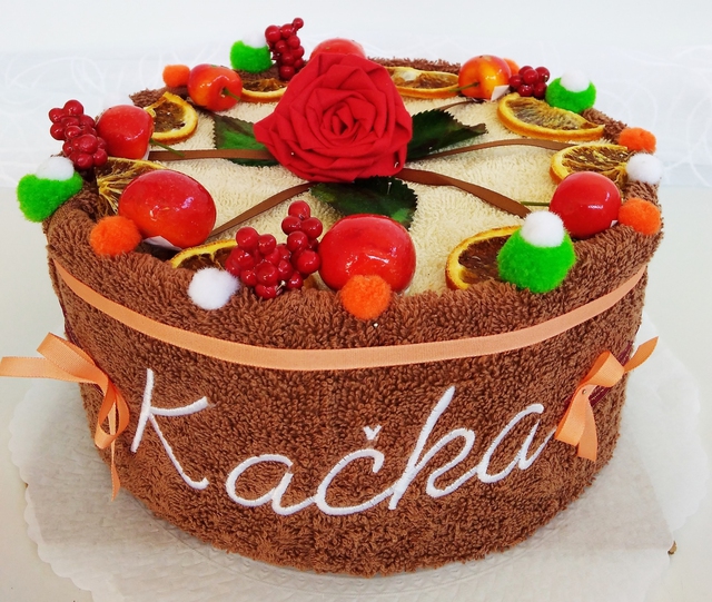 Textilní dort s jakýmkoliv jménem nebo nápisem - výběr ze 22 barev ručníků Text pro výšivku + barvu napište do poznámky. Textilní dort zdobený květy obsahuje: 1x ručník 50x100 cm + 1x ručník 30x50 cm Složení ručníků: 100% Bavlna, Vhodné jako originální dárek.
