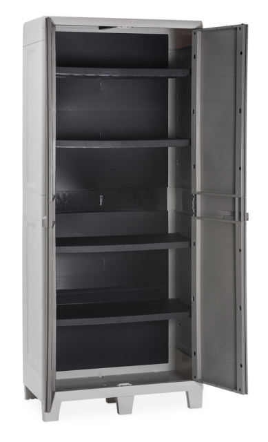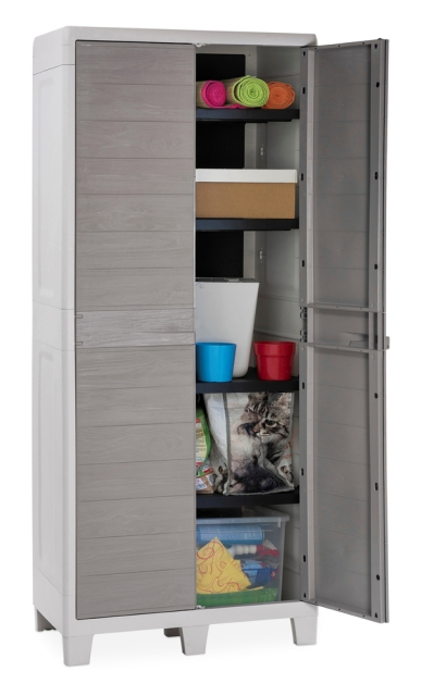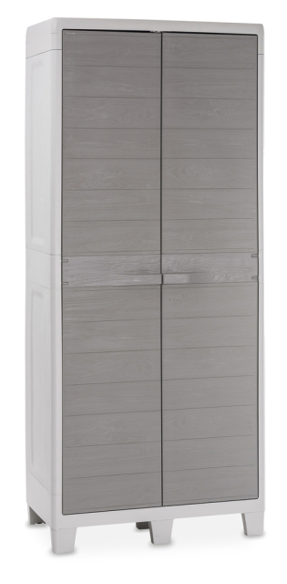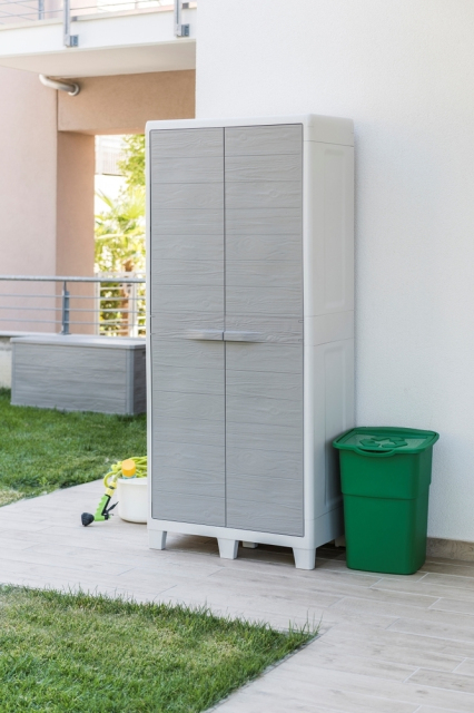 Objevte dokonalé řešení pro Vaši zahradu s naší vysokou dvoudvéřovou plastovou skříňkou WOODYS HIGH XL v módním provedení dvou elegantních světle šedých odstínů. Přinášíme Vám kombinaci praktičnosti a stylové estetiky s věrností k přírodě díky realistické imitaci dřevěného povrchu.